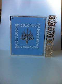 Unfortunately the light was poor when I tried to photograph this card. This is a request by my sister for her friend's 90th birthday. The edge die is by Tonic and the two centre dies are I think Joy Craft dies. The periwinkle card is the foundation card by Creative Expressions. The gold card I purchase from Joanna Sheen and pearls from stash.